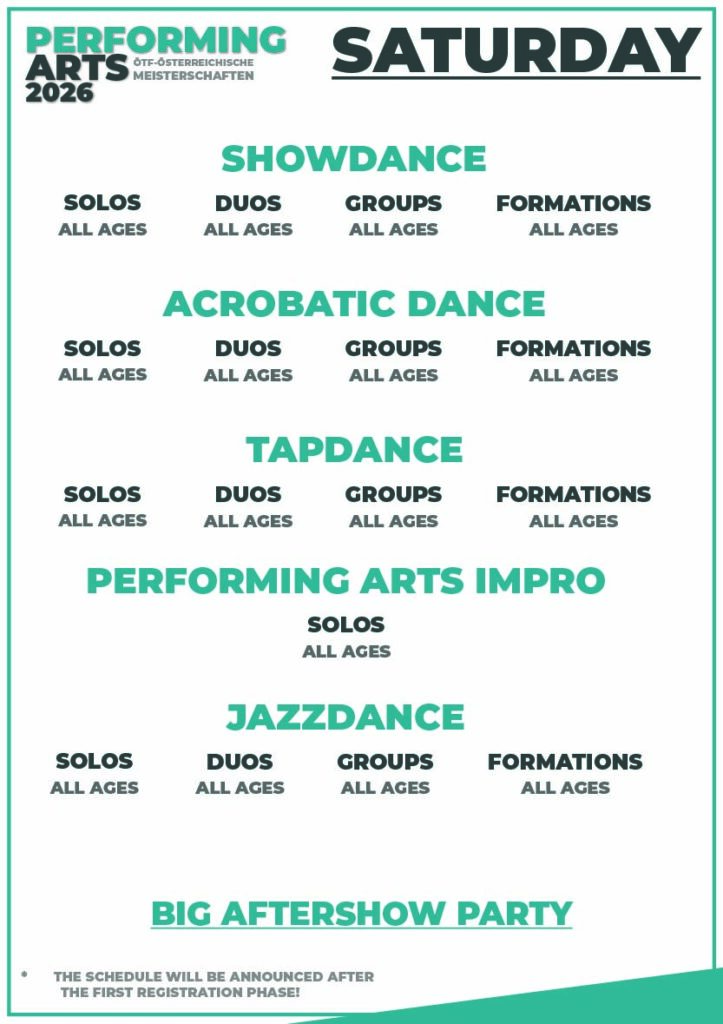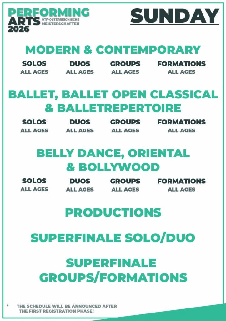 Each dancer pays an ÖTF annual start fee of 20,00 €. This is accounted for all dancers per institution! e.g., 15 dancers = 300,00 €